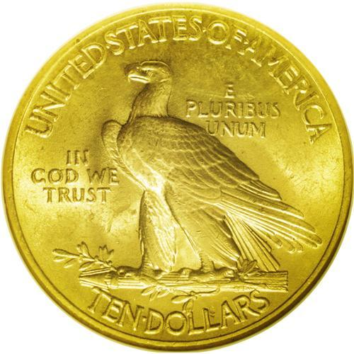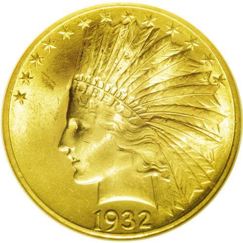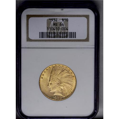 <B>1932<$10> MS64 NGC.</B></I> Vibrant luster adorns both sides of this lovely near-Gem. Peach-gold surfaces take on some traces of light tan, and the design elements show a powerful strike, though the left (right facing) claw reveals some of the customary softness often seen on this issue. Light contact marks on the cheek and neck and in the left obverse field define the grade.