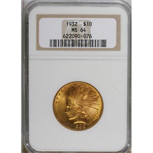 <B>1932 $10 MS64 NGC.</B></I> The lemon-gold and sun-gold fields have strong luster and a touch of haze that is suggestive of long-term storage. Solidly struck with just a few too many marks for a finer grade, but a pleasing type piece nonetheless.<BR><BR><B>Coin Engraver:</B> Augustus Saint-Gaudens<BR><BR><b>Shipping:</b> Coins & Currency (<a target="_blank" href="http://www.heritageauctions.com/common/shipping.php">view shipping information</a>)