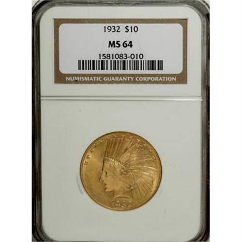 <B>1932 $10 MS64 NGC.</B></I> Though the apricot-gold surfaces show a number of luster grazes, they display few actual marks. A well-defined and pleasing Saint-Gaudens eagle that would make an excellent addition to a type set.<BR><BR><B>Coin Engraver:</B> Augustus Saint-Gaudens<BR><BR><b>Shipping:</b> Coins & Currency (<a target="_blank" href="http://www.heritageauctions.com/common/shipping.php">view shipping information</a>)