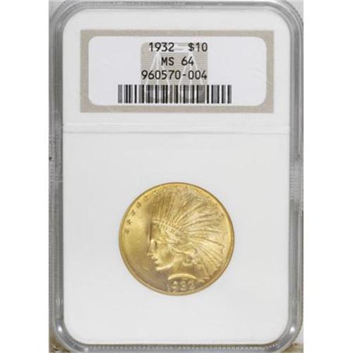 <B>1932 $10 MS64 NGC.</B></I> A gorgeous near-Gem with exceptional honey-gold luster and frosty surfaces. <BR><BR><B>Coin Engraver:</B> Augustus Saint-Gaudens<BR><BR><b>Shipping:</b> Coins & Currency (<a target="_blank" href="http://www.heritageauctions.com/common/shipping.php">view shipping information</a>)