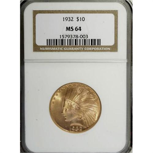 <B>1932 $10 MS64 NGC.</B></I> A strongly lustrous yellow-orange piece with hints of pink and violet on the portrait. Lightly marked overall with slightly above-average detail and interesting visual appeal.<BR><BR><B>Coin Engraver:</B> Augustus Saint-Gaudens<BR><BR><b>Shipping:</b> Coins & Currency (<a target="_blank" href="http://www.heritageauctions.com/common/shipping.php">view shipping information</a>)