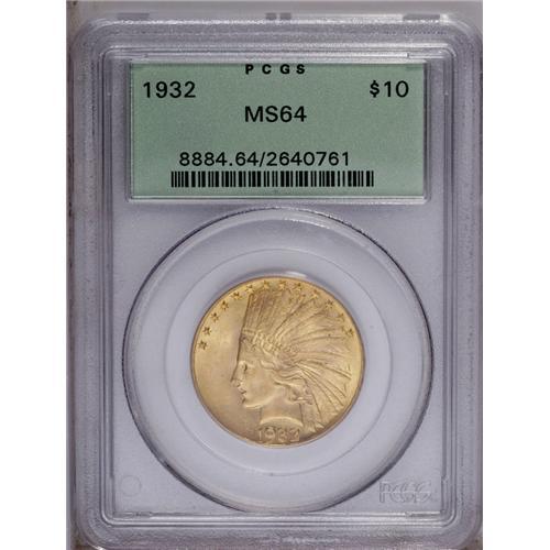 <B>1932 $10 MS64 PCGS.</B></I> The Indian's nostril is die doubled with a decent spread, a doubling class similar to that found on the 1984 Doubled Ear Lincoln Cent. A carefully preserved and lustrous orange-gold type coin, crisply struck except for some softness near the eagle's shoulder. Housed in a green label PCGS holder.
