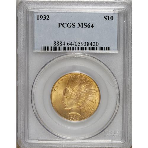 <B>1932 $10 MS64 PCGS.</B></I> A frosty near-Gem with exceptional bright yellow luster and traces of pink overtones. The surfaces have a few tiny ticks that are expected for the grade, and prevent a Gem determination.<BR><BR><b>Shipping:</b> Coins & Currency (<a target="_blank" href="http://www.heritageauctions.com/common/shipping.php">view shipping information</a>)