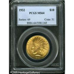<B>1932 $10 MS64 PCGS.</B></I> A glowing example of this late date circulation strike gold coin, a satiny Eagle with warm orange-golden surfaces. Minimal weakness appears at the top portion of the eagle's wing, with all other elements nicely pronounced. There is a small mark on the cheek, with a couple on the eagle on the reverse. Lot:8904