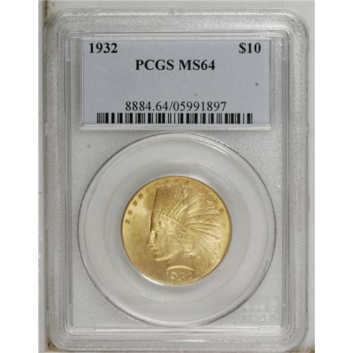<B>1932 $10 MS64 PCGS.</B></I> A lovely near-Gem example of this penultimate issue in the Indian Head eagle series. Lovely lime-gold toning adorns the satiny, matte-like surfaces, that have a few small, grade-limiting marks on each side.<BR><BR><b>Shipping:</b> Coin/Currency (<a target="_blank" href="http://www.heritageauctions.com/common/shipping.php">view shipping information</a>)