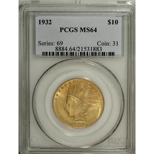 <B>1932 $10 MS64 PCGS.</B></I> A lovely yellow-orange Choice example of this popular type issue. Though the lower obverse has its share of marks, the devices display above-average definition overall.<BR><BR><b>Shipping:</b> Coins & Currency (<a target="_blank" href="http://www.heritageauctions.com/common/shipping.php">view shipping information</a>)