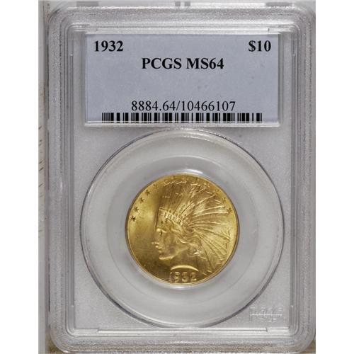 <B>1932<$10> MS64 PCGS.</B></I> A spot of bright light coined during the darkest days of the Great Depression, the 1932 eagles shine as one of the few readily obtainable gold coins from the 1930s. Most examples found typically grade MS62 or MS63. The present near-Gem MS64 offers radiant luster, enticing green-gold coloration, and a paucity of singular abrasions. The reverse is choice for the grade.
