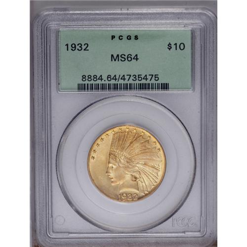 <B>1932 $10 MS64 PCGS.</B></I> An older holder near-Gem with potent luster and a good strike. Rich peach and lime colors confirm the eye appeal despite minor obverse marks. Unlike other gold issues from the 1930's, the 1932 eagle escaped Federal melting pots in sufficient numbers.