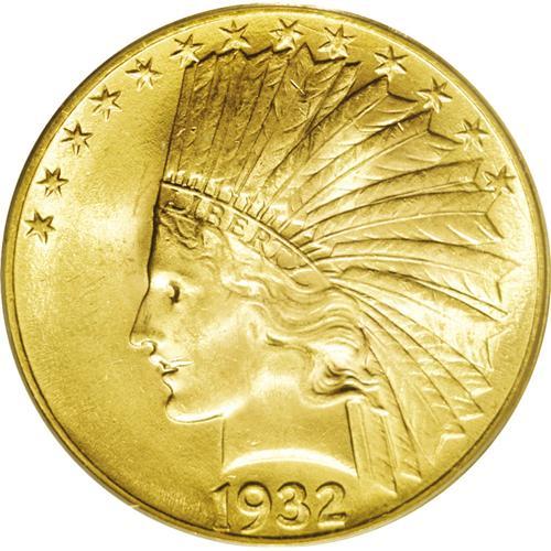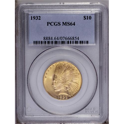 <B>1932<$10> MS64 PCGS.</B></I> Boldly struck and highly lustrous with rich orange-gold and pink coloration and carefully preserved surfaces overall. A small two-pronged abrasion at the corner of Liberty's mouth and several faint field marks on the reverse prevent the Gem grade assessment. Still an attractive and desirable Choice Mint State example of this penultimate issue in the series. <BR><BR><B>Important notice:</B> Heritage usually auctions material at the rate of 200-250 lots per hour. On some occasions eBay Live bid software or the Internet may not be able to keep up with the pace of the auction. We recommend placing a realistic absentee bid now as insurance to avoid disappointment. Occasionally the auctioneer may eliminate or reject an eBay Live bid, and the auctioneer may also reopen a lot after the close of the eBay live bidding (usually because we missed an audience bid), and may reject your bid even if it shows you as the winning bidder. By bidding via eBay Live, you agree that Heritage may award the lot to another bidder at its sole discretion under the circumstances described above or any other reasonable circumstances. Since eBay bids are not shown to us until we open the lot on the floor, we treat those bids just like floor bids. In most cases the floor responds before the eBay bid is presented to us, due to Internet lag time, so for consistency we have made it a policy that floor bids are always considered first over tie eBay live bids. Also please note that all Heritage lots purchased through eBay Live carry a 20% Buyer's Premium. Please make sure you read the Terms and Conditions before you bid. This lot is being auctioned in conjunction with a live floor auction by Heritage Galleries & Auctioneers. All final auction and invoice information will be supplied by Heritage Galleries & Auctioneers, and all other information should be considered preliminary. Lot:4167 <BR><BR><B>Winning Notification and Billing:</B> After the FINAL session in this auction is complete, Heritage will send e-mail and snail mail invoices. This process normally takes several days. All final auction and invoice information will be supplied by Heritage Galleries & Auctioneers, and all other information should be considered preliminary. <BR><BR>This auction will be conducted on a live auction floor and over the Internet through eBay Live. If you choose to place an absentee bid, please take a moment to <font color='#0000ff'><u><a href='http://pages.ebay.com/liveauctions/help/before/laabsentee.html'>learn how eBay Live absentee bidding works</a></u></font><font color='#000000'>