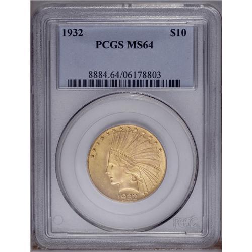 <B>1932<$10> MS64 PCGS.</B></I> Bright and frosty with radiantly lustrous, matte-like surfaces that are minimally abraded for a near-Gem. The 1932 Indian eagle is the only readily collectible gold issue from the 1930s.