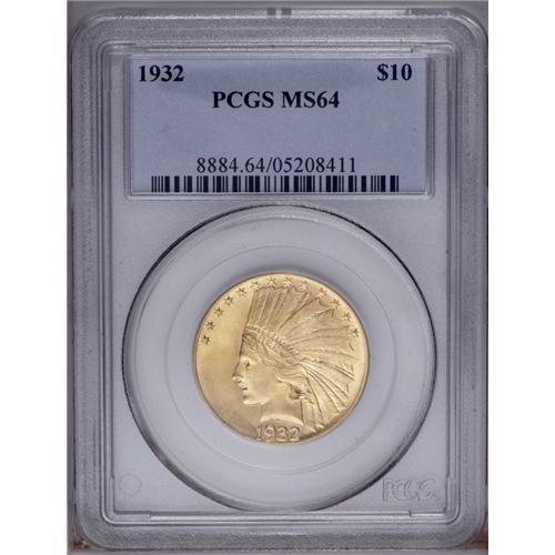 <B>1932<$10> MS64 PCGS.</B></I> Bright mint frost covers each side with yellow-gold coloration. Minimally abraded for this date.