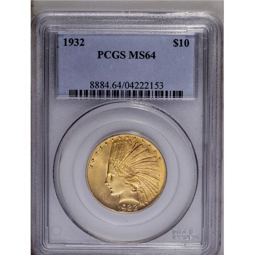<B>1932<$10> MS64 PCGS.</B></I> By far the most common date in the series, this satiny and lustrous piece provides a fantastic opportunity for one to own a near-Gem Indian eagle without having to spend a fortune. Bright yellow-golden surfaces with a couple of small marks on the Indian's cheek.
