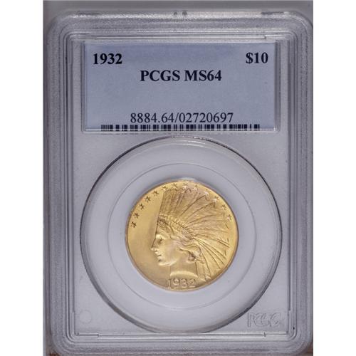 <B>1932 $10 MS64 PCGS.</B></I> Deeply toned and highly lustrous, this frosty rose-gold example shows a few wispy marks on Liberty's cheek that serve to keep it out of a Gem holder. A good looking type coin.
