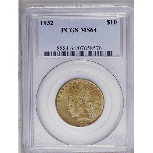 <B>1932<$10> MS64 PCGS.</B></I> Rich cartwheel sheen invigorates mustard-gold surfaces. A few wispy luster grazes cross the reverse field, but these do not deny the eye appeal. The only available gold issue of any denomination from the 1930s.