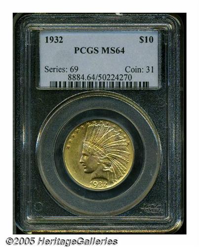 1932 $10 MS64 PCGS. Sharply defined throughout, t