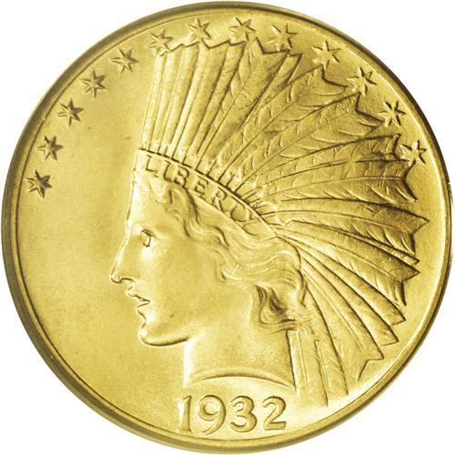 <B>1932<$10> MS64 PCGS.</B></I> Sharply defined throughout, with fine-grain surface textures and scintillating luster. The obverse seems untouched, but a few wispy marks on the reverse seem to preclude a higher grade. Widely recognized as the most easily obtainable date in the series of Indian Head eagles.