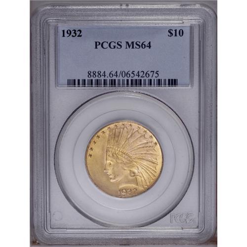 <B>1932<$10> MS64 PCGS.</B></I> Smooth fields greet the viewer of this lustrous honey-gold piece. A couple of moderate marks on the eagle's wing and leg limit the grade.