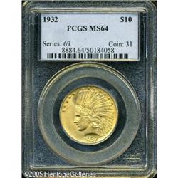 <B>1932 $10 MS64 PCGS.</B></I> This Choice Mint State example has frosty luster and excellent eye appeal. A splendid example and the only plentiful gold coin of the 1930s. Lot:8903