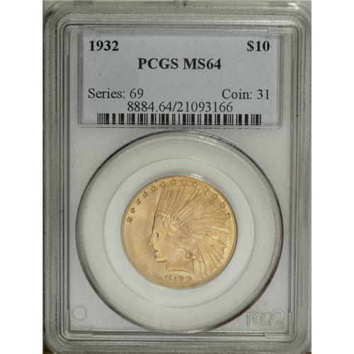 <B>1932 $10 MS64 PCGS.</B></I> This subtly lustrous yellow-orange piece has lovely peach accents on each side. The overall eye appeal is high, and light marks on the chin and in the nearby fields have little impact.<BR><I>From The James Paul Collection.</B></I><BR><BR><b>Shipping:</b> Coin/Currency (<a target="_blank" href="http://www.heritageauctions.com/common/shipping.php">view shipping information</a>)