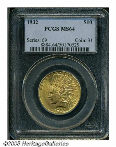 <B>1932<$10> MS64 PCGS.</B></I> Well struck and fully lustrous, with bright peach-gold surfaces that have a few minor marks, on each side, that prevent the Gem grade, but fail to significantly detract from the pleasing overall appearance of this lovely near-Gem.