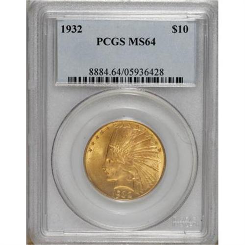 <B>1932 $10 MS64 PCGS.</B></I> Regardless of the reasons for the unusually high mintage for the 1932 eagle, that issue gives type collectors a golden opportunity. This near-Gem example displays pleasing detail and soft, shimmering luster. Lightly marked on the yellow-orange reverse.<BR><BR><b>Shipping:</b> Coins & Currency (<a target="_blank" href="http://www.heritageauctions.com/common/shipping.php">view shipping information</a>)