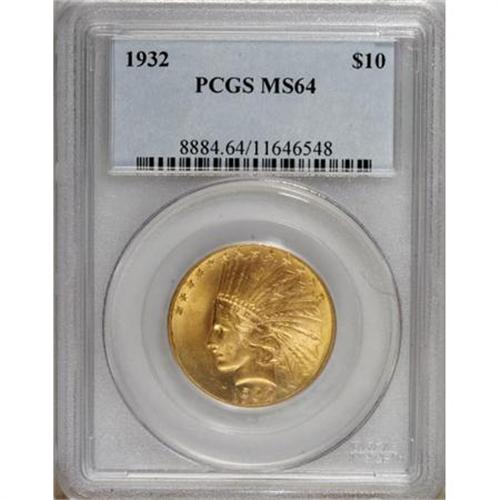 <B>1932 $10 MS64 PCGS.</B></I> Boldly struck and highly lustrous, with just a few minuscule surface blemishes. The essentially brilliant surfaces show subtle accents of lime-green and rose. <BR><BR><b>Shipping:</b> Coins & Currency (<a target="_blank" href="http://www.heritageauctions.com/common/shipping.php">view shipping information</a>)