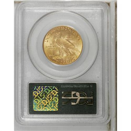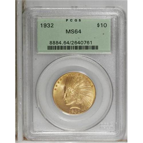 <B>1932 $10 MS64 PCGS.</B></I> The Indian's nostril is die doubled with a decent spread, a doubling class similar to that found on the 1984 Doubled Ear Lincoln cent. A carefully preserved and lustrous orange-gold type coin, crisply struck except for some softness near the eagle's shoulder. Housed in a green label PCGS holder.<BR><BR><b>Shipping:</b> Coins & Currency (<a target="_blank" href="http://www.heritageauctions.com/common/shipping.php">view shipping information</a>)