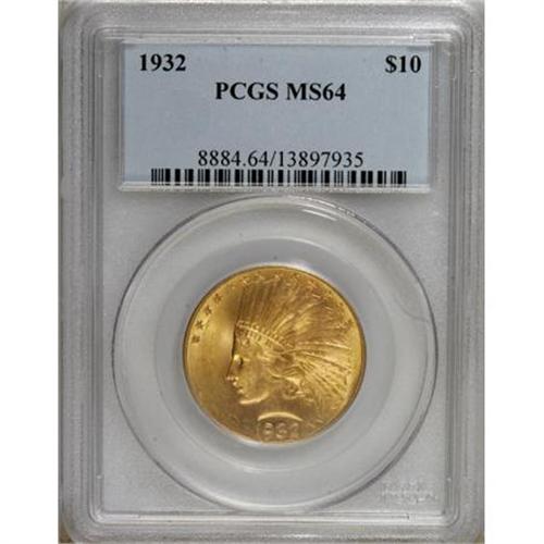 <B>1932 $10 MS64 PCGS.</B></I> Glowing luster issues from yellow-gold surfaces, and a solid strike brings out excellent definition on the motifs. A few minor scuffs and marks define the grade.<BR><BR><b>Shipping:</b> Coins & Currency (<a target="_blank" href="http://www.heritageauctions.com/common/shipping.php">view shipping information</a>)
