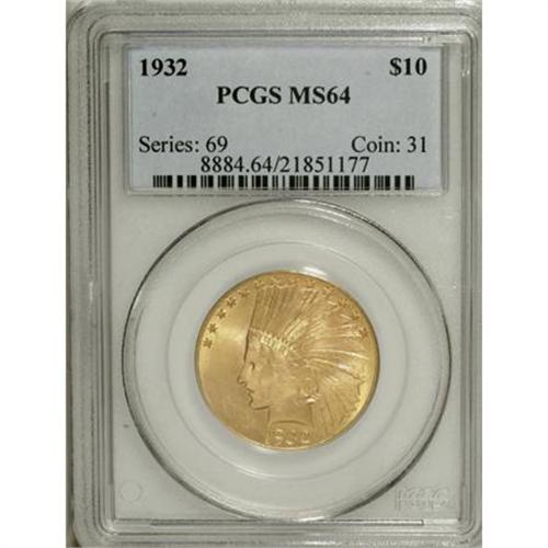 <B>1932 $10 MS64 PCGS.</B></I> A slightly frosty and well-defined Choice example of this popular type issue. The reverse is butter-yellow, while the obverse has a slightly lighter cast. Though over 4.4 million pieces were struck for this issue, the next year saw Roosevelt's mandatory recall of gold coinage.<BR><BR><b>Shipping:</b> Coins & Currency (<a target="_blank" href="http://www.heritageauctions.com/common/shipping.php">view shipping information</a>)