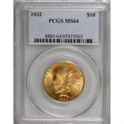 <B>1932 $10 MS64 PCGS.</B></I> A wonderful yellow-gold example of this readily collectible Saint-Gaudens eagle issue, well-defined with excellent visual appeal. The devices are clean, though the area to the left of the date shows a luster scrape and accompanying marks.<BR><BR><B>Coin Engraver:</B> Augustus Saint-Gaudens<BR><BR><b>Shipping:</b> Coins & Currency (<a target="_blank" href="http://www.heritageauctions.com/common/shipping.php">view shipping information</a>)