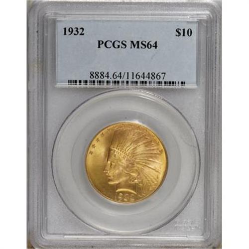 <B>1932 $10 MS64 PCGS.</B></I> PCGS Population (5758/874). NGC Census: (6914/1865). Mintage: 4,463,000. Numismedia Wsl. Price for NGC/PCGS coin in MS64: $1,850. (#8884)<BR><BR><B>Coin Engraver:</B> Augustus Saint-Gaudens<BR><BR><b>Shipping:</b> Coins & Currency (<a target="_blank" href="http://www.heritageauctions.com/common/shipping.php">view shipping information</a>)