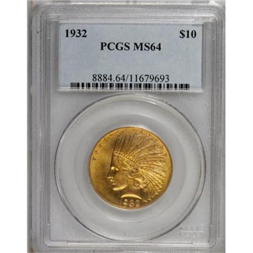 <B>1932 $10 MS64 PCGS.</B></I> A pleasingly detailed near-Gem that shows a hint of haze over the vibrant yellow-gold surfaces. This piece has clean fields, though Liberty's lower cheek displays a short abrasion. Overall, an attractive type coin.<BR><BR><B>Coin Engraver:</B> Augustus Saint-Gaudens<BR><BR><b>Shipping:</b> Coins & Currency (<a target="_blank" href="http://www.heritageauctions.com/common/shipping.php">view shipping information</a>)