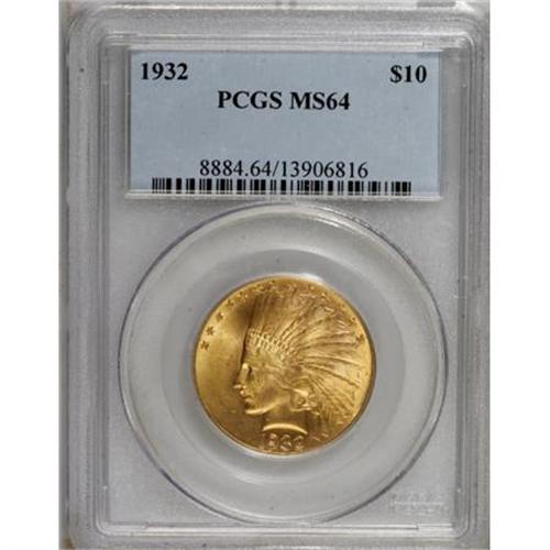 <B>1932 $10 MS64 PCGS.</B></I> Attentively detailed overall with only a hint of softness on the portrait. Delicate, swirling luster and a hint of haze influence the faintly marked yellow-gold fields of this pleasing type coin.<BR><BR><B>Coin Engraver:</B> Augustus Saint-Gaudens<BR><BR><b>Shipping:</b> Coins & Currency (<a target="_blank" href="http://www.heritageauctions.com/common/shipping.php">view shipping information</a>)