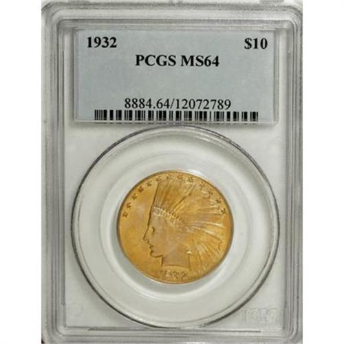 <B>1932 $10 MS64 PCGS.</B></I> Well-defined with strongly lustrous yellow-gold surfaces that show hints of blue and green in the fields. The fields are clean, though a handful of wispy marks on the portrait keep this type coin from a Gem grade.<BR><BR><B>Coin Engraver:</B> Augustus Saint-Gaudens<BR><BR><b>Shipping:</b> Coins & Currency (<a target="_blank" href="http://www.heritageauctions.com/common/shipping.php">view shipping information</a>)