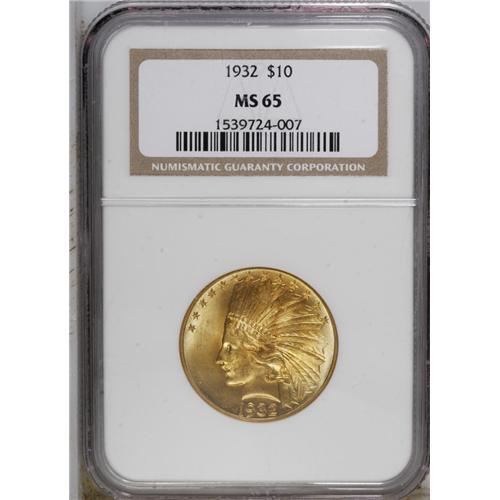 <B>1932<$10> MS65 NGC.</B></I> Gem examples of this commonplace date see unceasing demand, a combination of their widespread availability in grades up through Superb Gem and their characteristics as a well-produced P-mint issue. The present specimen boasts lovely orange-gold surfaces with resplendent luster. A well struck and delectable piece.