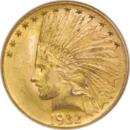 <B>1932 $10 MS65 NGC.</B></I> This Indian gold type coin has ebullient luster and original sun-gold toning. Occasional minor marks are distributed on the reverse. The 1932 eagle is the only readily collected U.S. gold coin from its decade, although undoubtedly, a large portion of the mintage was eventually melted into gold bars by the Treasury.<BR><BR><B>Coin Engraver:</B> Augustus Saint-Gaudens<BR><BR><b>Shipping:</b> Coins & Currency (<a target="_blank" href="http://www.heritageauctions.com/common/shipping.php">view shipping information</a>)