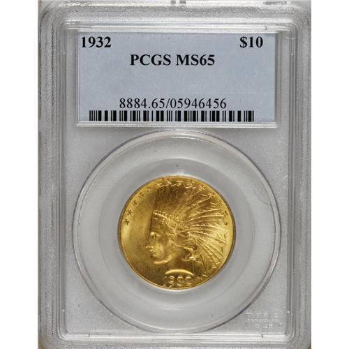 <B>1932 $10 MS65 PCGS.</B></I> Highly lustrous surfaces characterize this brilliant yellow-gold Gem. Both sides are crisply detailed, nearly medallic in appearance. The 1932 eagle is extremely popular with collectors and represents the only gold coin struck during the 1930s that is widely available.<BR><BR><b>Shipping:</b> Coins & Currency (<a target="_blank" href="http://www.heritageauctions.com/common/shipping.php">view shipping information</a>)