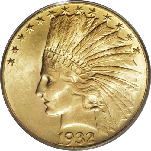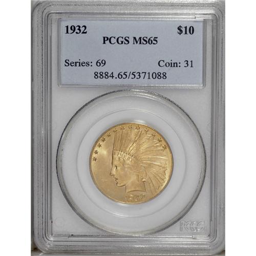 <B>1932 $10 MS65 PCGS.</B></I> Rich apricot and khaki-gold shades embrace this lustrous and carefully preserved Gem. This attractive gold type coin lacks obtrusive marks, and the strike is sharp save for slight softness on the lower left portion of the eagle's front wing. The 1932 is the only collectible gold issue of any denomination from the 1930s.<BR><I>From The James Paul Collection.</B></I><BR><BR><b>Shipping:</b> Coin/Currency (<a target="_blank" href="http://www.heritageauctions.com/common/shipping.php">view shipping information</a>)