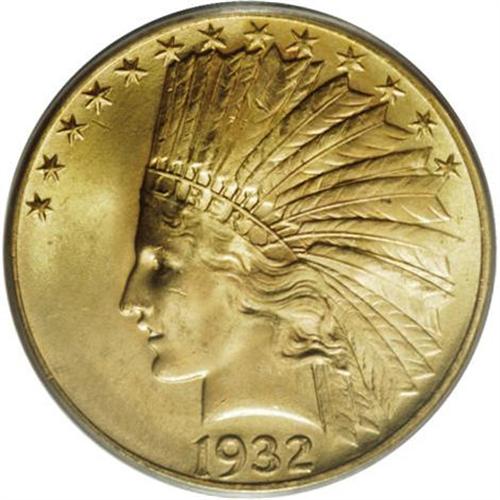 <B>1932 $10 MS65 PCGS.</B></I> The 1932 Indian ten is the only common date gold coin in the 1930s, and this Gem is a desirable piece. It has the usual frosty mint luster and brilliant yellow-gold color that is seen on nearly all surviving examples. Only 78 finer examples have been certified by PCGS (4/07).<BR><BR><b>Shipping:</b> Coins & Currency (<a target="_blank" href="http://www.heritageauctions.com/common/shipping.php">view shipping information</a>)