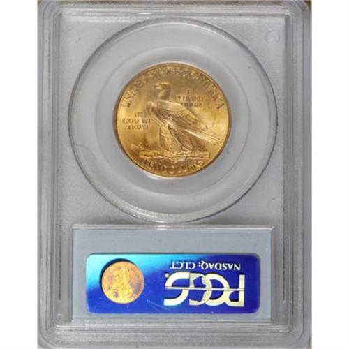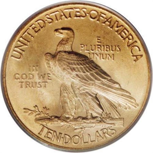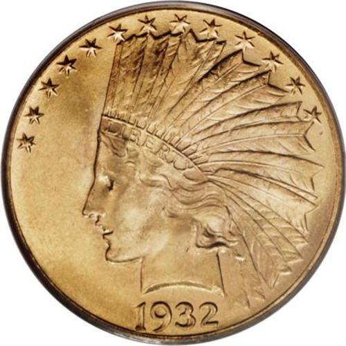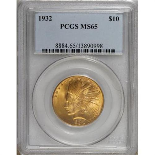 <B>1932 $10 MS65 PCGS.</B></I> An ideal piece for the type collector who desires high quality at a reasonable price, this frosty Gem exhibits exceptionally brilliant yellow-gold luster with traces of bluish patina on each side. The surfaces have a few tiny marks that are consistent with the grade.<BR><BR><b>Shipping:</b> Coins & Currency (<a target="_blank" href="http://www.heritageauctions.com/common/shipping.php">view shipping information</a>)