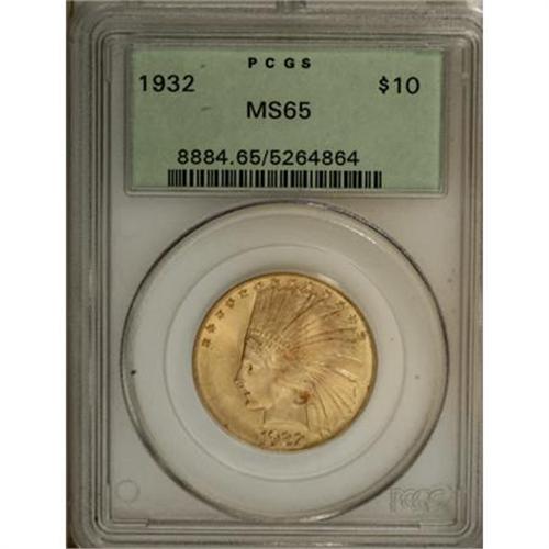 <B>1932 $10 MS65 PCGS.</B></I> This stunning Gem, displayed in an older PCGS green label holder, has amazing eye appeal. The surfaces are highly lustrous with hints of rose toning on each side. A few other tiny splashes of copper toning are evident on each side. While we feel that this piece is accurately graded, we have seen many less desirable examples in higher grade holders. Perhaps worth of resubmission consideration.<BR><BR><B>Coin Engraver:</B> Augustus Saint-Gaudens<BR><BR><b>Shipping:</b> Coins & Currency (<a target="_blank" href="http://www.heritageauctions.com/common/shipping.php">view shipping information</a>)