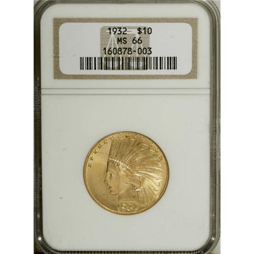 <B>1932 $10 MS66 NGC.</B></I> A radiant Premium Gem example of this, the only readily available gold coin issue from the 1930s, produced in the year that Franklin Delano Roosevelt was first elected president. Crisp yellow- and orange-gold areas vie for territory amid the blazing luster and a near-total lack of surface impairments.<BR><BR><b>Shipping:</b> Coins & Currency (<a target="_blank" href="http://www.heritageauctions.com/common/shipping.php">view shipping information</a>)