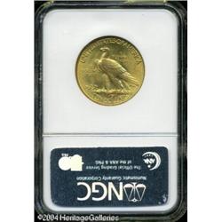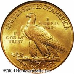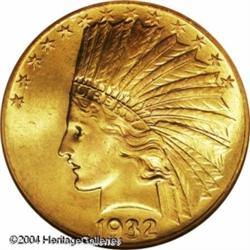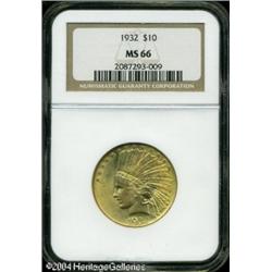 1932 $10 MS66 NGC. The 1932 is the most common Ind <B>1932 $10 MS66 NGC.</B></I> The 1932 is the most common Indian Head Eagle in Mint State. It is also the commonest issue in Gem condition, with several hundred MS65 examples extant. Above that level, the 1932 is rare, as only a few really superb examples exist. The Premium Gem we offer here is bright golden-orange, with rose colored accents and vibrant luster. Sharply impressed design features prevail. A couple of marks on the Indian's chin are observed. A couple of small alloy spots are also noted on the reverse above the eagle's head. A truly beautiful coin with superb eye appeal. <BR><BR><B>Important notice:</B> Heritage usually auctions material at the rate of 200-250 lots per hour. On some occasions eBay Live bid software or the Internet may not be able to keep up with the pace of the auction. We recommend placing a realistic absentee bid now as insurance to avoid disappointment. Occasionally the auctioneer may eliminate or reject an eBay Live bid, and the auctioneer may also reopen a lot after the close of the eBay live bidding (usually because we missed an audience bid), and may reject your bid even if it shows you as the winning bidder. By bidding via eBay Live, you agree that Heritage may award the lot to another bidder at its sole discretion under the circumstances described above or any other reasonable circumstances. Since eBay bids are not shown to us until we open the lot on the floor, we treat those bids just like floor bids. In most cases the floor responds before the eBay bid is presented to us, due to Internet lag time, so for consistency we have made it a policy that floor bids are always considered first over tie eBay live bids. Also please note that all Heritage lots purchased through eBay Live carry a 20% Buyer's Premium. Please make sure you read the Terms and Conditions before you bid. This lot is being auctioned in conjunction with a live floor auction by Heritage Galleries & Auctioneers. All final auction and invoice information will be supplied by Heritage Galleries & Auctioneers, and all other information should be considered preliminary. Lot:6828
