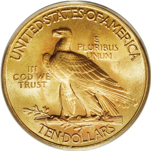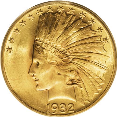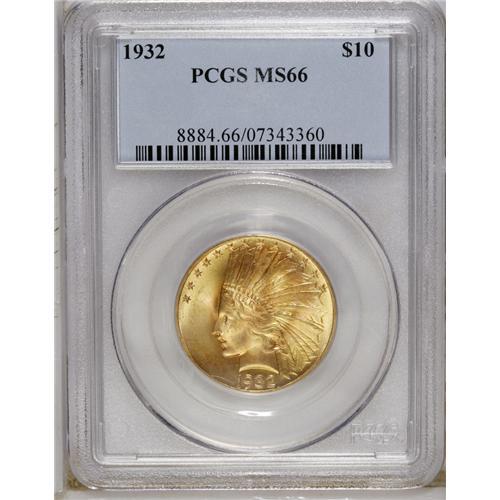 <B>1932 $10 MS66 PCGS.</B></I> This bright, radiantly lustrous Premium Gem ten dollar displays a gorgeous array of apricot-gold, yellow-gold, and mint-green coloration. The design elements are exquisitely brought up, with excellent delineation apparent in the feathers on the bonnet and on the eagle. A finer grade is perhaps limited by a few light marks scattered about. Population: 71 in 66, 1 finer (11/06).<BR><BR><b>Shipping:</b> Coin/Currency (<a target="_blank" href="http://www.heritageauctions.com/common/shipping.php">view shipping information</a>)