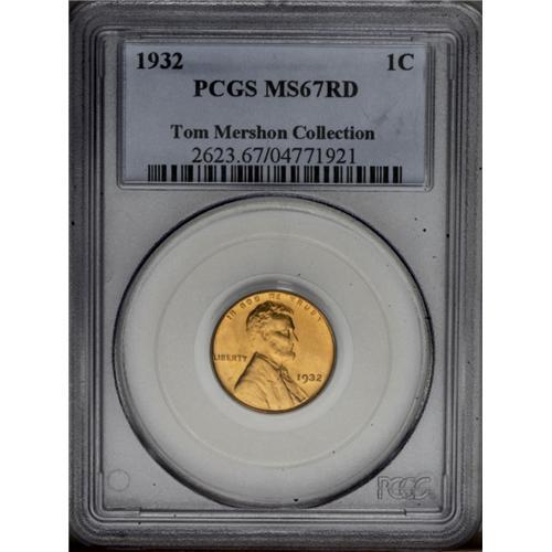 <B>1932<1C> MS67 Red PCGS.</B></I> Ex: Tom Mershon Collection. With more than 9 million coins produced, the 1932 is anything but rare in an absolute sense. At the MS67 Red level, however, this date is elusive, and collectors who are assembling PCGS Registry sets of this series should take note than there are no coins certified finer. The reddish-orange surfaces are smooth from rim to rim with virtually no carbon to report. Sharply struck and fully lustrous, both sides possess eye appeal to spare. Population: 22 in 67, 0 finer (3/06).<BR><I>From The Kendall Marie #4 All-Time Finest PCGS Registry of Lincoln Cents with Varieties, Circulation Strikes, 1909-1958.</B></I> <BR><BR><B>Important notice:</B> Heritage usually auctions material at the rate of 200-250 lots per hour. On some occasions eBay Live bid software or the Internet may not be able to keep up with the pace of the auction. We recommend placing a realistic absentee bid now as insurance to avoid disappointment. Occasionally the auctioneer may eliminate or reject an eBay Live bid, and the auctioneer may also reopen a lot after the close of the eBay live bidding (usually because we missed an audience bid), and may reject your bid even if it shows you as the winning bidder. By bidding via eBay Live, you agree that Heritage may award the lot to another bidder at its sole discretion under the circumstances described above or any other reasonable circumstances. Since eBay bids are not shown to us until we open the lot on the floor, we treat those bids just like floor bids. In most cases the floor responds before the eBay bid is presented to us, due to Internet lag time, so for consistency we have made it a policy that floor bids are always considered first over tie eBay live bids. Also please note that all Heritage lots purchased through eBay Live carry a 20% Buyer's Premium. Please make sure you read the Terms and Conditions before you bid. This lot is being auctioned in conjunction with a live floor auction by Heritage Galleries & Auctioneers. All final auction and invoice information will be supplied by Heritage Galleries & Auctioneers, and all other information should be considered preliminary. Lot:533 <BR><BR><B>Winning Notification and Billing:</B> After the FINAL session in this auction is complete, Heritage will send e-mail and snail mail invoices. This process normally takes several days. All final auction and invoice information will be supplied by Heritage Galleries & Auctioneers, and all other information should be considered preliminary. <BR><BR>This auction will be conducted on a live auction floor and over the Internet through eBay Live. If you choose to place an absentee bid, please take a moment to <font color='#0000ff'><u><a href='http://pages.ebay.com/liveauctions/help/before/laabsentee.html'>learn how eBay Live absentee bidding works</a></u></font><font color='#000000'>