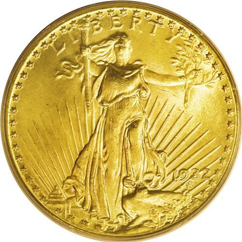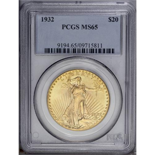<B>1932<$20> MS65 PCGS.</B></I> This is the final collectible date in the double eagle series, although the term "collectible" is only relevant to those with a considerable numismatic budget. The mintage of this issue does not support its actual rarity, as over 1 million of these coins were actually produced, yet few survive. President Franklin D. Roosevelt took steps to outlaw the possession and use of gold coins the year after these pieces were struck, and few had actually been distributed. The remaining stock of 1932 double eagles and other gold coins that were still in Treasury vaults were melted, along with virtually the entire mintage of 1933 double eagles.<BR> In his <I>A Guide Book of Double Eagle Gold Coins,</B></I> author Q. David Bowers estimated that only about 60 to 80 of these 1932 double eagles still exist. He commented: "The 1932 is one of the most desired of all Saint-Gaudens double eagles, representing as the last readily collectible date. Somewhere between 60 to 80 different pieces are estimated to exist in numismatic hands, nearly all of which are Choice or Gem quality, lustrous, and very beautiful." Years earlier, Walter Breen took a much stronger position regarding rarity, suggesting that "possibly 22-25 survive" in his <I>Complete Encyclopedia of U.S. Coins.</B></I> Current population data from PCGS and NGC more closely support the Bowers estimate, with a total combined population of 124 coins. Regarding the grade distribution of these pieces, 112 out of these 124 certification events are in the MS63 to MS66 range with an average grade of MS64.2, meaning that this Gem MS65 piece is slightly above average for the date.<BR> This superlative Gem is sharply struck and it possesses exceptional aesthetic appeal with satiny yellow-gold luster and subtle pink coloration. Although a few tiny abrasions are evident in the fields and on the devices, the overall quality is fully consistent with the grade. Population: 17 in 65, 7 finer (9/06).