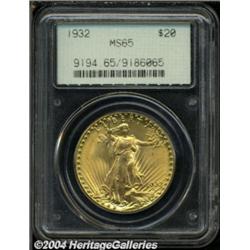 <table><tbody><tr><td><table> <TR><TD width="100%"><TABLE cellSpacing=1 cellPadding=3 width="100%" border=0><TBODY><TR><TD width="100%" bgColor=#79735c><FONT face=arial color=#ffffff size=3><B>Description</B> </FONT></TD></TR><TR><TD width="100%" bgColor=#ffffff><FONT face=arial size=2><B>1932 $20 MS65 PCGS.</B></I> The 1932 Saint-Gaudens is a modern day rarity whose numbers have not been increased over the years by hoards or European stockpiles of bullion gold. Akers estimates that out of the 1.1 million pieces struck, only 50-60 pieces exist today in all grades. The 1932 is a member of the very elite 1929-32 club, a group of twenties whose general unavailability is of near legendary proportions. Most coin collectors and non-specialists have never seen these coins and they usually only appear for sale in major public auctions. By combining the total coins graded by both NGC and PCGS the following picture emerges about just how rare a coin this date is in this condition: the services have graded a combined 25 pieces in MS65 with 8 in higher grades (10/03). This represents a substantial number of the known specimens of this date, remember there are probably no circulated examples known.<BR>This is a heavily frosted coin whose luster gives the piece an exceptional eye appeal. Characteristically there is a ring of heavy metal flow around the periphery of each side. The color is a very pleasing greenish yellow-gold and the strike is sharp and well above average in all areas. There are a few moderate sized abrasions on the reverse that account for the grade, but none of the usual "small stuff" that can interrupt the surfaces of these large gold coins. Three distinguishing marks for pedigree purposes are: an abrasion on the eagle's right wing, one on the left wing, and one on the breast. An exciting opportunity for the advanced collector of this popular series. Population: 13 in 65, 3 finer (10/03).<BR><I>From a Magnificent Collection of Double Eagles.</B></I> </FONT></TD></TR></TBODY></TABLE></TD></TR></TBODY></TABLE><BR><A name=PricesRealized></A><TABLE cellSpacing=0 cellPadding=0 width="100%" bgColor=#000000 border=0><TBODY><TR><TD width="100%"><TABLE cellSpacing=1 cellPadding=3 width="100%" border=0><TBODY><TR><TD width="100%" bgColor=#79735c><A name=PR><FONT face=arial color=#ffffff size=3><B>Previous Prices from Heritage Auctions</B> </FONT></A></TD></TR><TR><TD bgColor=#f6f6ed><TABLE cellSpacing=0 cellPadding=0 width="100%" border=1><TBODY><TR><TD align=middle width="33%"><B>Date</B></TD><TD align=middle width="33%"><B>Service</B></TD><TD align=middle width="33%"><B>Price</B></TD></TR><TR bgColor=whitesmoke><TD width="33%"><B>09/20/2003</B></TD><TD width="33%">PCGS</TD><TD width="33%">$46,000.00</TD></TR><TR bgColor=whitesmoke><TD width="33%"><B>06/04/1999</B></TD><TD width="33%">NGC</TD><TD width="33%">$25,300.00</TD></TR><TR bgColor=whitesmoke><TD width="33%"><B>01/01/1993</B></TD><TD width="33%">PCGS</TD><TD width="33%">$35,750.00</TD></TR><TR bgColor=whitesmoke><TD width="33%"><B>05/01/1990</B></TD><TD width="33%">NGC</TD><TD width="33%">$68,750.00</TD></TR></TBODY></TABLE></TD></TR><TR><TD bgColor=#ffffff><FONT face=arial size=1 ?>PLEASE NOTE: All prices realized reflect the final hammer price PLUS the buyer's premium in auctions that charge a buyer's premium. Each item has a notation at the top of the listing indicating whether that lot included a buyer's premium. Example: A item that sells with a final hammer price of $100 and a 20% buyer's premium will display with a price realized of $120. All information listed is intended to be as accurate as possible, but errors are possible. Please use this guide carefully and inform us of any inaccuracies. </FONT></TD></TR></TBODY></TABLE></TD></TR></TBODY></TABLE><BR><TABLE cellSpacing=0 cellPadding=0 width="100%" bgColor=#000000 border=0><TBODY><TR><TD width="100%"><TABLE cellSpacing=1 cellPadding=3 width="100%" border=0><TBODY><TR><TD width="100%" bgColor=#79735c colSpan=6><FONT face=arial color=#ffffff size=3><B>Price Guide*</B> </FONT></TD></TR><TR bgColor=#f6f6ed><TD align=middle><B>Grade</B> </TD><TD align=middle><B>Coin World<BR>(Trends)</B> </TD><TD align=middle><B>Numismedia<BR>Retail</B> </TD><TD align=middle><B>Numismedia<BR>Wholesale</B> </TD><TD align=middle><B>Coin<BR>Universe</B> </TD><TD align=middle><B>Heritage<BR>Value Index</B> </TD></TR><TR bgColor=#ffffff><TD align=middle>64</TD><TD align=right>$40,000.00</TD><TD align=right>---</TD><TD align=right>$23,500.00</TD><TD align=right>$32,000.00</TD><TD align=right>$25,050.00</TD></TR><TR style="FONT-WEIGHT: bold" bgColor=#cccfdd><TD align=middle>65</TD><TD align=right>$50,000.00</TD><TD align=right>---</TD><TD align=right>$32,500.00</TD><TD align=right>$45,000.00</TD><TD align=right>$33,416.67</TD></TR><TR bgColor=#ffffff><TD align=middle>66</TD><TD align=right>$75,000.00</TD><TD align=right>---</TD><TD align=right>$62,500.00</TD><TD align=right>$65,000.00</TD><TD align=right>$50,000.00</TD></TR><TR bgColor=#ffffff><TD colSpan=6><FONT size=1>*All information listed is intended to be as accurate as possible, but errors are possible. No item may be returned or refused based on this information which is provided as a service to our customers. You should contact each pricing source directly to determine the accuracy of this information. </FONT></TD></TR></TBODY></TABLE></TD></TR></TBODY></TABLE><BR><TABLE cellSpacing=0 cellPadding=0 width="100%" bgColor=#000000 border=0><TBODY><TR><TD width="100%"><TABLE cellSpacing=1 cellPadding=3 width="100%" border=0><TBODY><TR><TD width="100%" bgColor=#79735c><FONT face=arial color=#ffffff size=3><B>Population Guide</B> </FONT></TD></TR><TR bgColor=#ffffff><TD align=middle><!-- Begin Output of Population Grid--><TABLE cellSpacing=0 cellPadding=0 width="100%" border=0><TBODY><TR><TD vAlign=center><TABLE cellSpacing=0 width="100%" border=1 cellsadding="3"><TBODY><TR><TD vAlign=center><TABLE cellSpacing=0 cellPadding=3 width="100%" border=1><