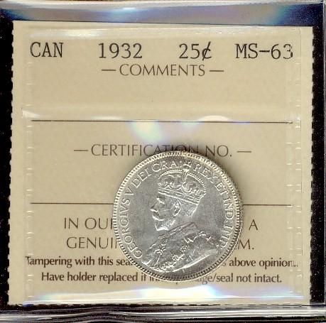 1932 25¢ ICCS MS63. Very lustrous example with little toning.
