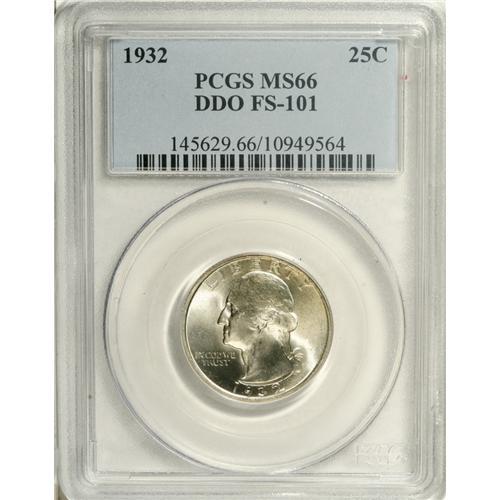 <B>1932 25C --Doubled Die Obverse--MS66 PCGS.</B></I> FS-101. Prominent die doubling is observed on Washington's nostril, earlobe, and hair bun. Sharply struck and essentially untoned, this highly lustrous Premium Gem is also impressively preserved.<BR><BR><b>Shipping:</b> Coins & Currency (<a target="_blank" href="http://www.heritageauctions.com/common/shipping.php">view shipping information</a>)