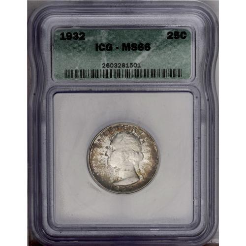 <B>1932<25C> MS66 ICG.</B></I> This Premium Gem displays splotches of olive-green, deep mauve, and gold-brown patination over fully lustrous surfaces that exhibit well struck design features. Some minute marks on Washington's temple and in the hair are mentioned for accuracy.<BR><I>From The Houston Collection of Washington Quarters.</B></I>